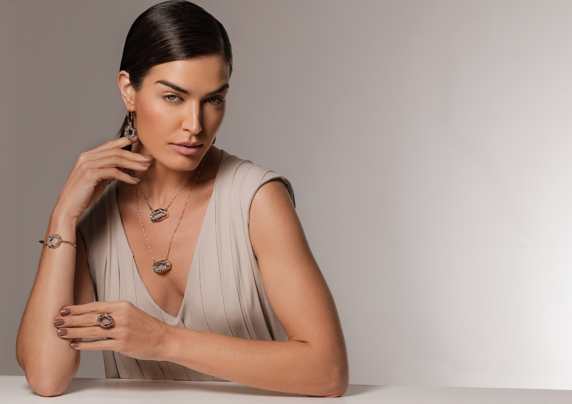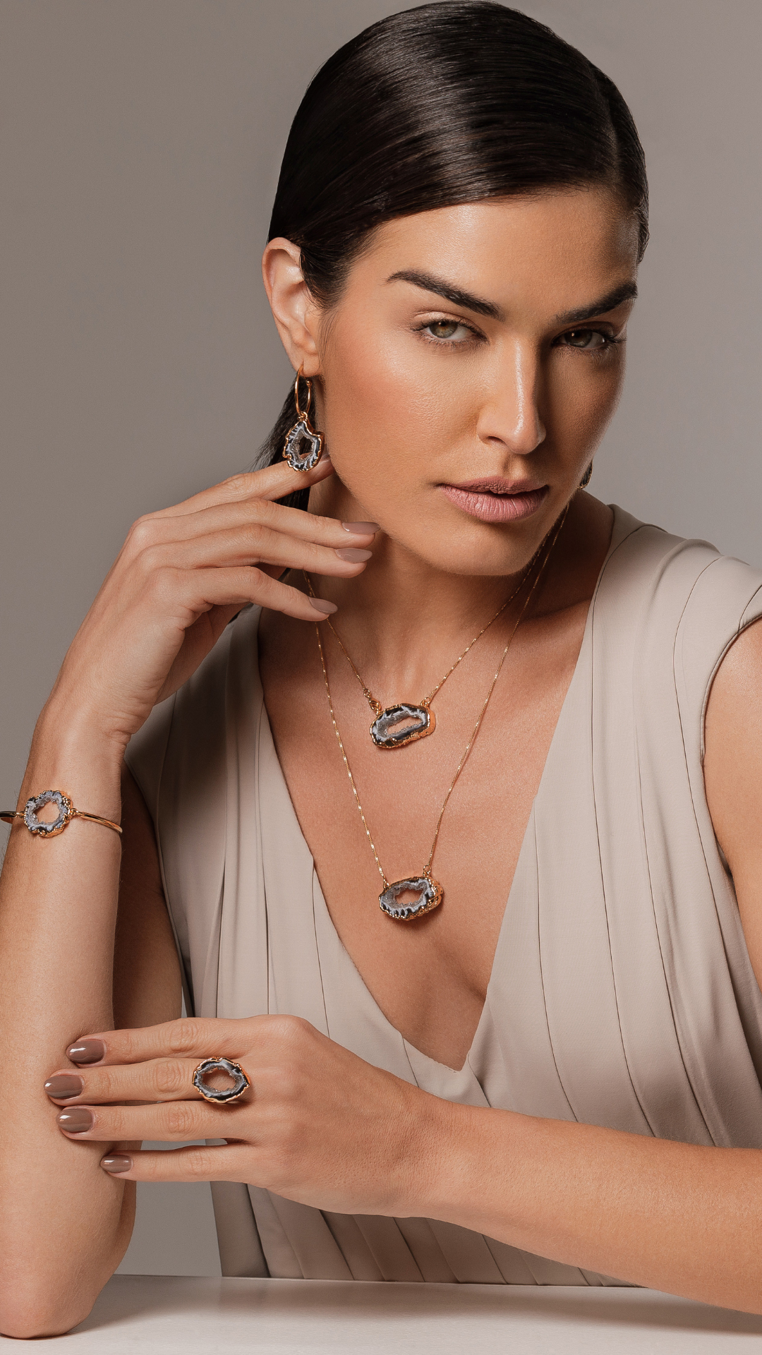 Ofrecemos una variedad de piezas de joyería adornadas con piedras naturales (cristales semipreciosos) como Amatista; Cuarzo Rosa; Turmalina Negra; Cuarzo Cristal de Roca; Esmeralda Brasileña; Ágata de Fuego y muchas otras.